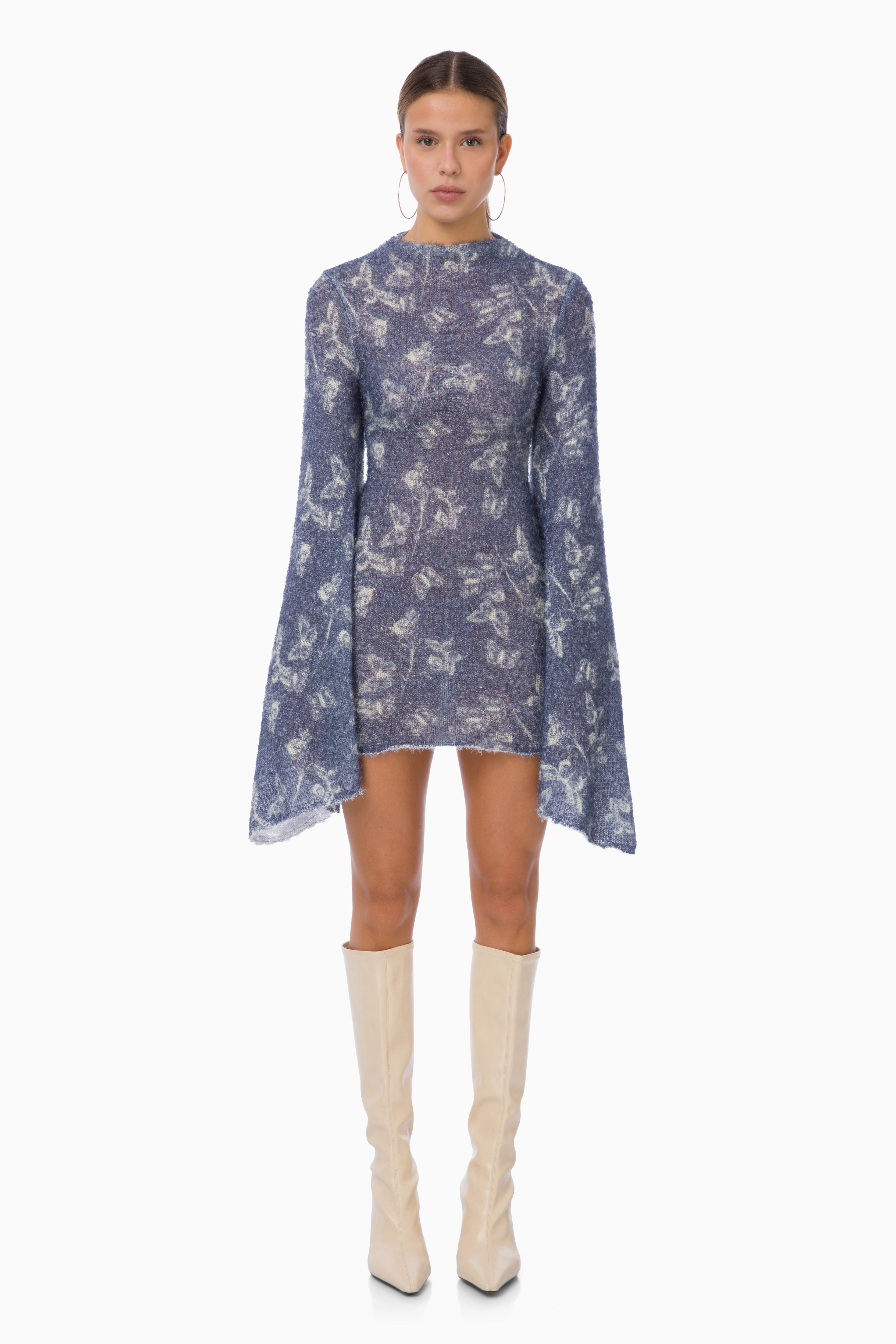Yume Knit Dress blends romance and refinement through its blue butterfly-patterned and lightly sequined fabric. The fitted mini silhouette highlights the body, while the long wide sleeves create a contemporary shape. The knit texture ensures comfort, and the shimmering details add a sophisticated glow. Mi Magic Love — embrace the elegance of butterfly patterns.