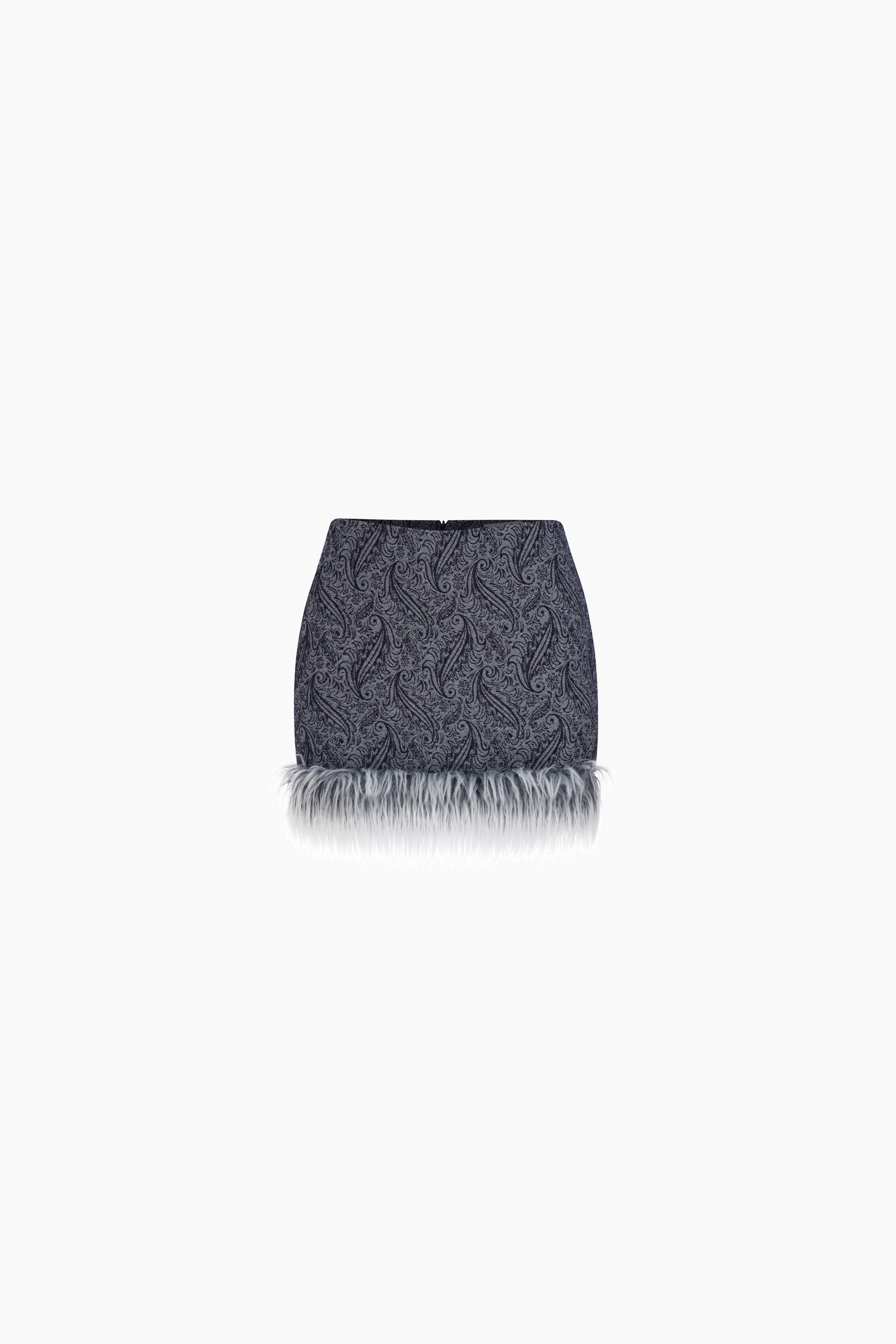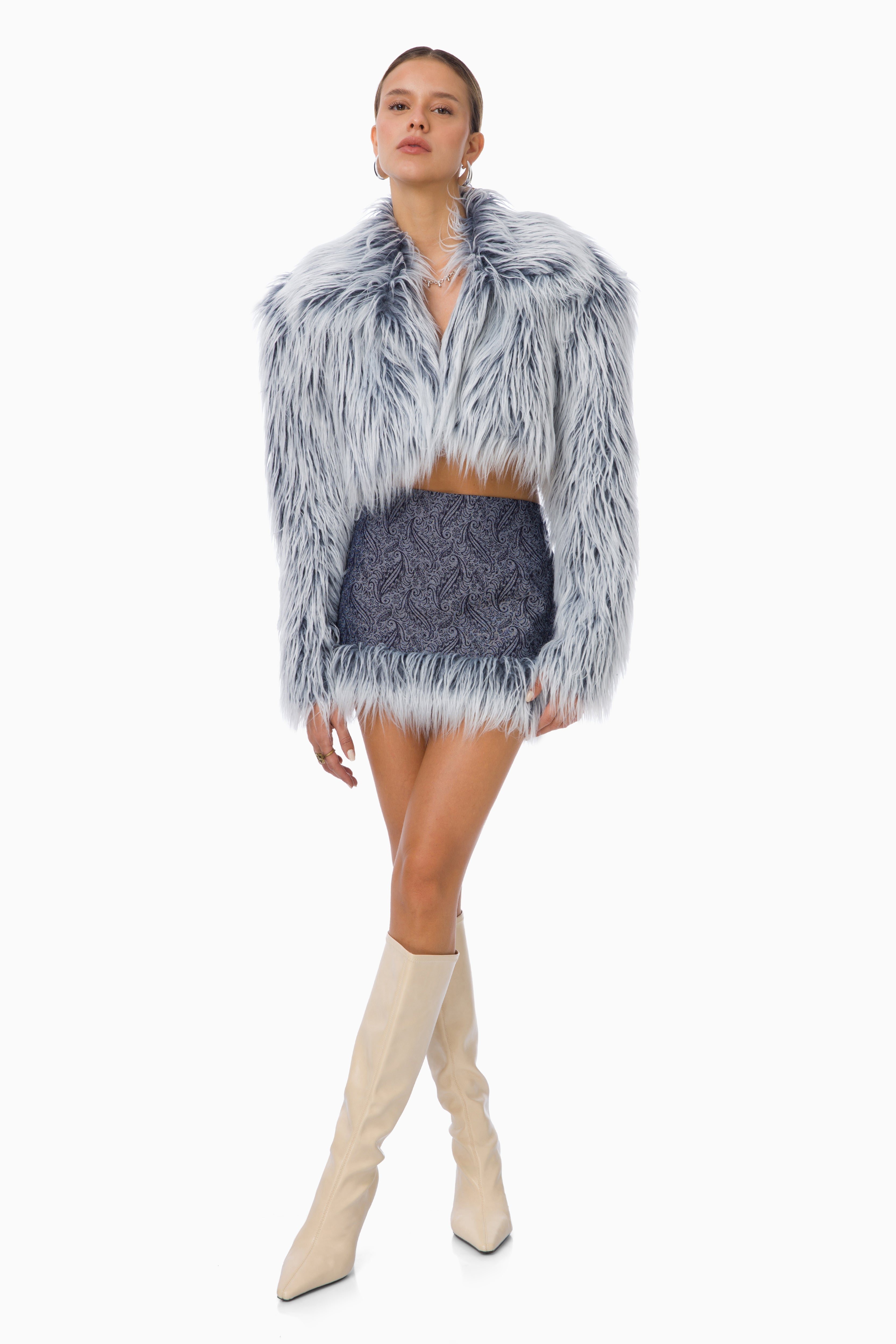 Milena Furry Mini Skirt offers an energetic and eye-catching style with its dark blue patterned denim fabric. The mid-rise waist and slim fit highlight the body’s form, while the icy blue fur trim adds a playful contrast. A bold and original piece that stands out in any look. Mi Magic Love — embrace the beauty of being different.